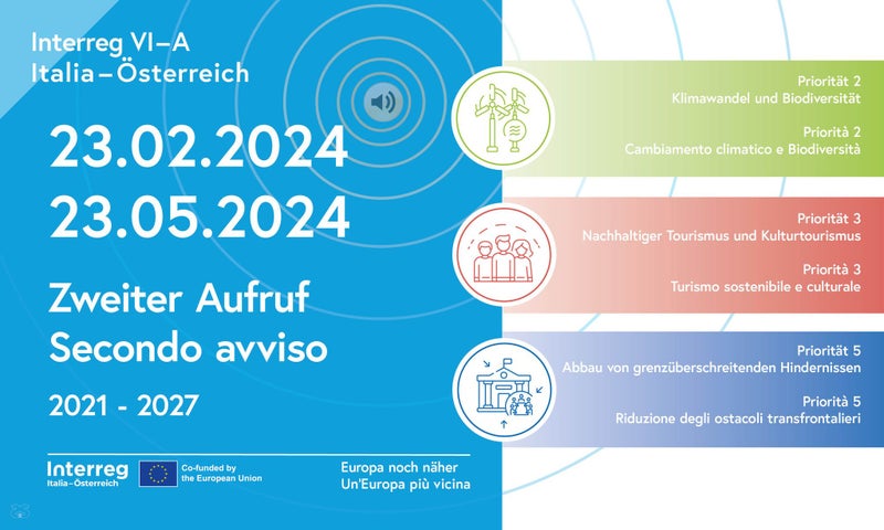 Ab heute, Freitag, 23. Februar bis 23. Mai 2024, können im Rahmen des EU-Programms Interreg Italien-Österreich VI-A 2021-2027 Projektvorschläge eingereicht werden. Unternehmen, Genossenschaften, öffentliche oder private Körperschaften, Gebietskörperschaften, Vereine oder Forschungseinrichtungen sind aufgefordert, im Rahmen des zweiten Aufrufs grenzübergreifende Projektanträge in den Bereichen Klimawandel und Biodiversität (Priorität 2), Nachhaltiger Tourismus und Kulturtourismus (Priorität 3) sowie Abbau von grenzüberschreitenden Hindernissen (Priorität 5) vorzulegen.